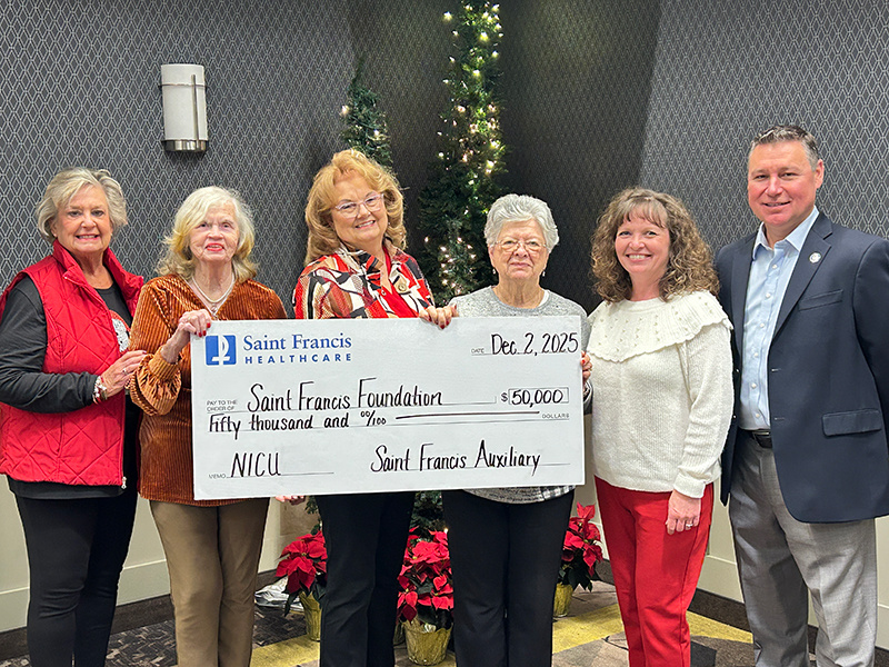 Auxilians Donate: Saint Francis Auxiliary Board members present check; Janet Esicar; BJ Bowman; Judi Owens; Betty Caroll; Teresa Hannah, Manager - Volunteer Services, and Stacy Huff, Saint Francis Foundation Executive Director.